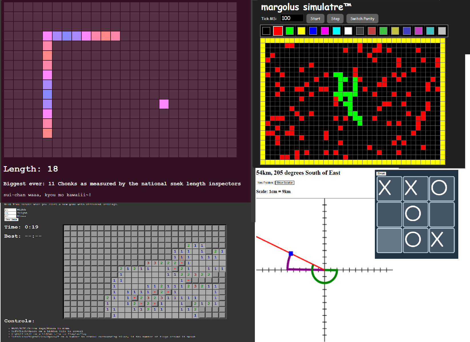 It includes minesweeper, snake, a weird cellular automaton simulator, a bouncing rectangle, a dice game whose sprites have since disappeared, tic tac toe but your opponent is yourself, a tool to compute when you should play a song to hit the drop at exactly 12:00 AM on new year, and a thing that draws vector angles.